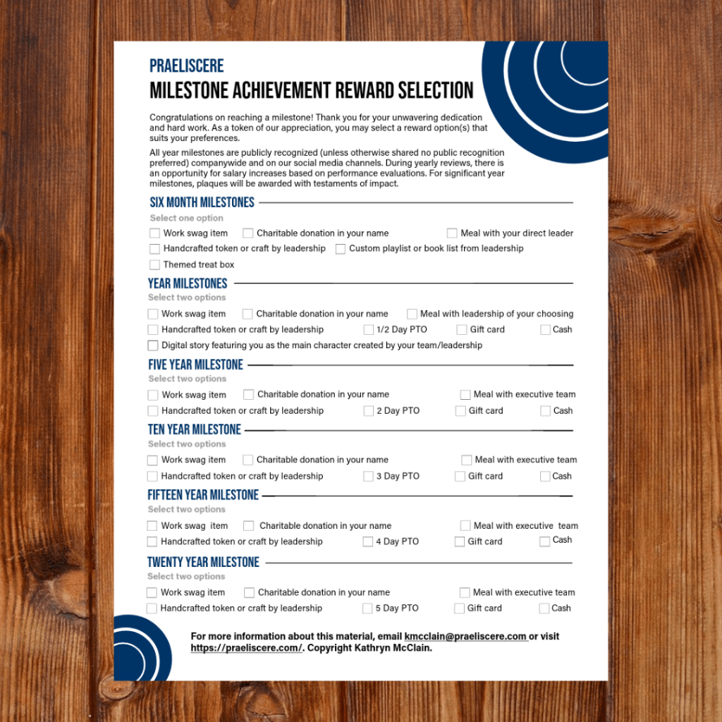 Celebrate employee dedication and loyalty with this affordable, easy-to-use and customizable Milestone Achievement Rewards Selection one-sheeter. Designed to support employee recognition, retention strategies, and a positive workplace culture, this resource helps you acknowledge key anniversaries and achievements with thoughtful, personalized rewards.