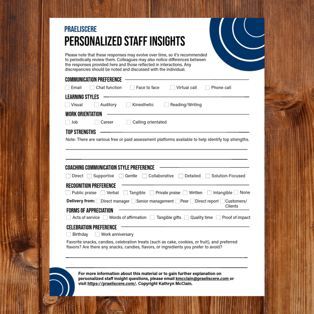 Unlock deeper understanding of your team with this affordable, easy-to-use Personalized Staff Insights one-sheeter. This comprehensive resource captures key information on each employee’s unique strengths, work orientation, learning styles, and preferences for communication, coaching, recognition, appreciation, and celebration.